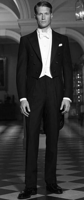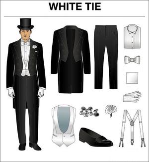 A „White Tie” viselet a lehető legelegánsabb öltözet. Uraknak frakkot, speciális (piké) anyagú inget, mellényt és kézzel kötött csokornyakkendőt jelent. Kiegészítője a speciális escarpens cipő és a hófehér nadrágtartó. Hölgyeknek „White Tie” esetén nagyestélyi a kötelező viselet. |