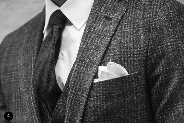 4. kép: Ennek a példának az erőssége inkább az anyagválasztásban nyilvánul meg. A flaneles öltönyszövethez jól társítható a kissé rusztikus hatású gyapjú nyakkendő. A színválasztás tekintetében az öltönyszövet kék csíkozása némiképp tereli a lehetőségeket, s bár ez nem jelent törvényszerű korlátozást, a kék árnyalat elfogadható döntés a szürke szövethez, főként azért is, mert minta nélküli a nyakkendő. Fontos figyelembe vennünk, hogy amennyiben mintás környezetben kell egyensúlyt teremtenünk, úgy tartsuk magunkat a következő mintadinamikai szabályhoz: ha erőteljes az öltönyszövet mintázata legyen visszafogottabb az ingszövet hatása, erre pedig jöhet a domináns nyakkendő. Így tarjuk a kiegyensúlyozott ritmust a minták között.